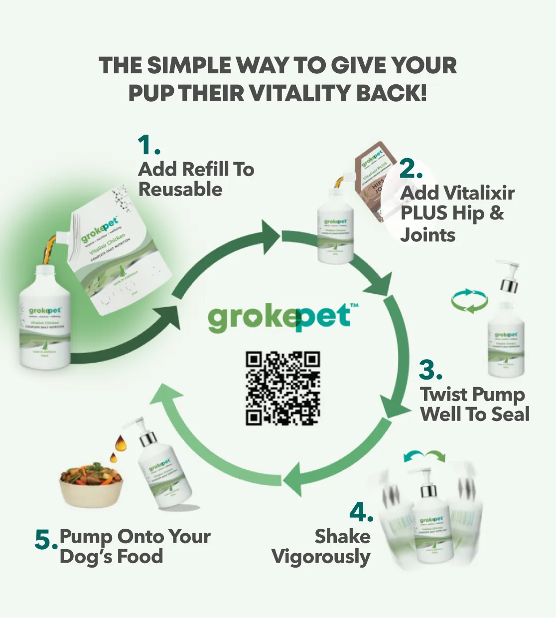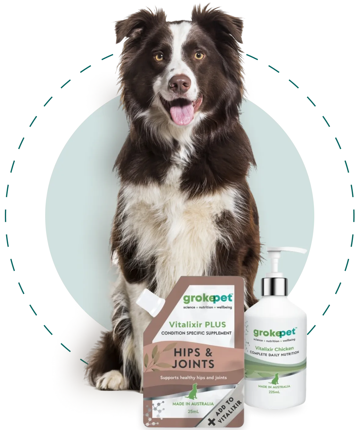 Vitalixir PLUS Hip and Joints is suitable for dogs of all types and ages. The Groke Pet cat formula is coming soon! Always follow the recommended dosage for your pet's weight.